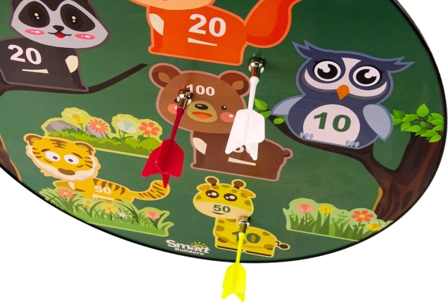 Dieses magnetische Zielscheibenspiel bietet Kindern stundenlange, freudige und sichere Unterhaltung. Die bunte grüne Scheibe ist mit Tieren (Giraffe, Fuchs, Tiger u. a.) und Punktewerten gestaltet, die zur Leistungssteigerung motivieren. Der magnetische Mechanismus ersetzt scharfe Spitzen, sodass das Spiel auch für jüngere Kinder geeignet ist.