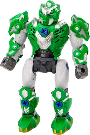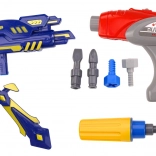 Im Set enthalten sind ein kinderfreundlicher Bohrer und ein Schraubendreher für kleine Hände sowie drei wechselbare Aufsätze. Nach dem Zusammenbau kann das Batteriemodul aus dem Bohrer als Antrieb genutzt werden und der Roboter fährt vorwärts oder rückwärts. Das Spiel wird durch Licht- und Soundeffekte sowie thematische Accessoires – ein Schwert und eine dunkelblaue Waffe – für spannende Missionen und Geschichten noch intensiver.