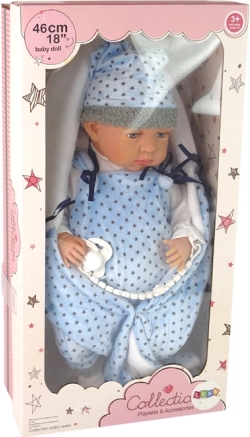 Diese 46 cm große Puppe hat ein realistisches Aussehen, mit beweglichen Armen, Beinen und Kopf, was zu einem wirklich authentischen Spielerlebnis beiträgt. Weiche und angenehme Materialien sorgen dafür, dass die Puppe angenehm zu berühren ist. Das Kind kann mit dem Wechseln der Kleidung spielen, da die Puppe leicht austauschbare Kleidung hat. Das Outfit beinhaltet einen blau-schwarzen Schlafanzug und eine Decke im Sternen-Stil.