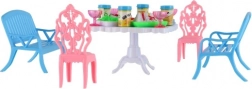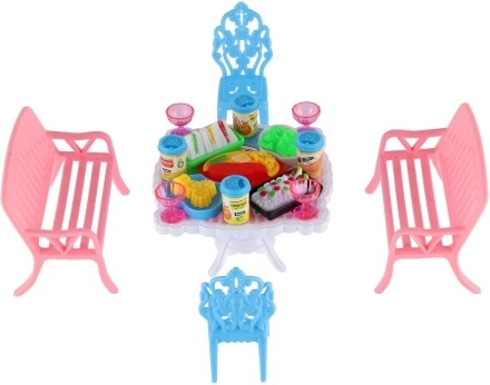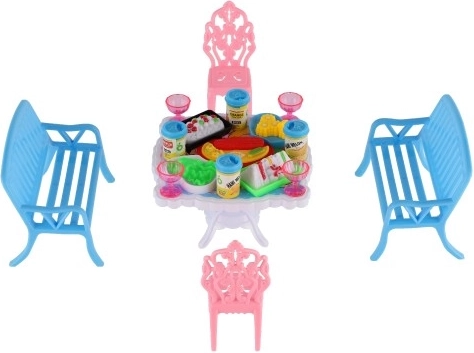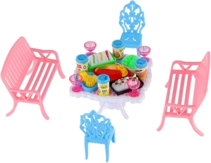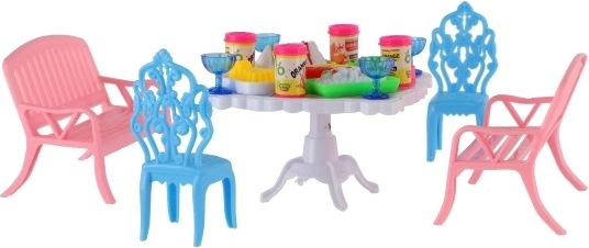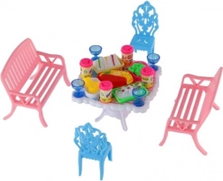 Das Set enthält 2 Bänke, 2 Stühlchen und einen Tisch, ergänzt um 13 Zubehörteile – Gläser, Getränkedosen, Teller und ein Tablett. Alles, was Sie für das Festmahl Ihrer Puppen brauchen.