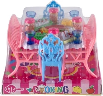 Fröhliche rosa und blaue Elemente mit einem weißen Tisch ergeben einen attraktiven Farbmix. Realistisch gestaltete Mini-Accessoires verleihen dem Restaurantspiel den richtigen Pfiff.