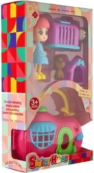 Eine niedliche Puppe, ein Hündchen und ein Häschen, ergänzt um Häuschen und Transportbox, bieten Kindern vielfältige Szenarien und fördern ihre Vorstellungskraft und Feinmotorik.