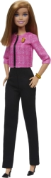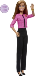 Barbie ist bereit, mit ihrem eleganten rosa-schwarzen Outfit und den Accessoires Geschichten über Führung zu inspirieren.