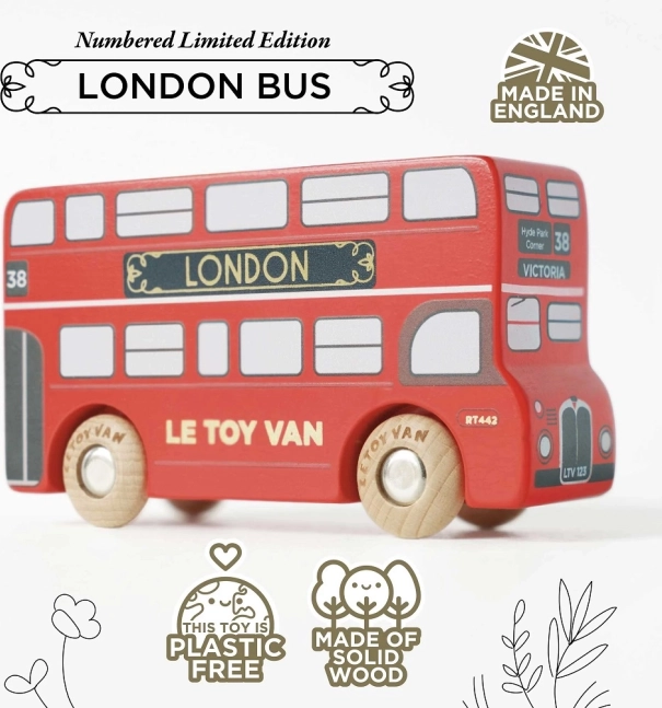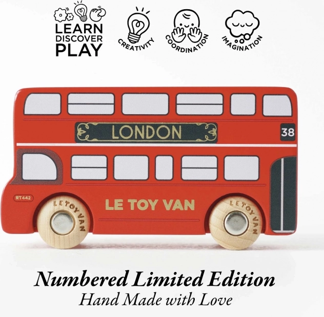 Begeben Sie sich auf ein Abenteuer mit der limitierten Auflage des Londoner Busses! Dieses einzigartige Spielzeug ist sorgfältig von Hand nummeriert und aus langlebigem Holz in Großbritannien gefertigt, das dank der traditionellen roten Farbe und goldenen Details ein authentisches Erlebnis bietet.