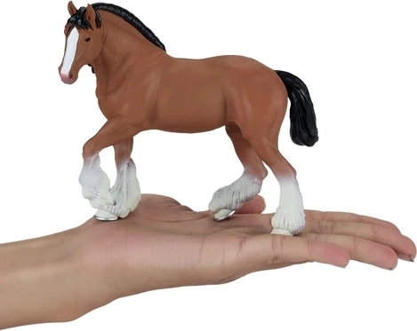 Die mächtige Statur des Clydesdale-Pferdes ist naturgetreu eingefangen: feine Fellstruktur, ausgeprägte Muskulatur, Mähne und Fesselbehang. Attraktiv für die Vitrine und fürs Kinderspiel.