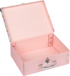 Der Koffer besteht aus robustem laminiertem Papier mit metallischen Beschlägen, was seine lange Lebensdauer und Widerstandsfähigkeit gegen Beschädigungen garantiert.