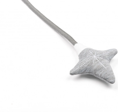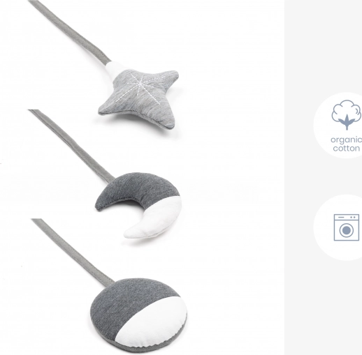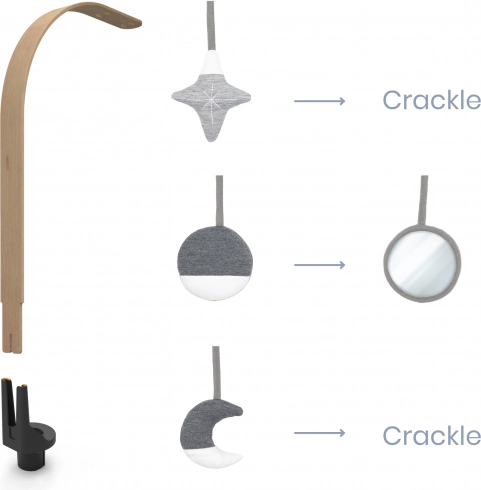 Drei am Bogen hängende Spielsachen stimulieren die Sinne des Kindes durch Farbkontraste und knisternde Geräusche.
