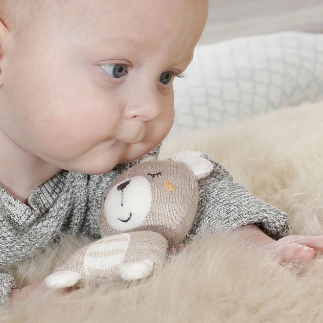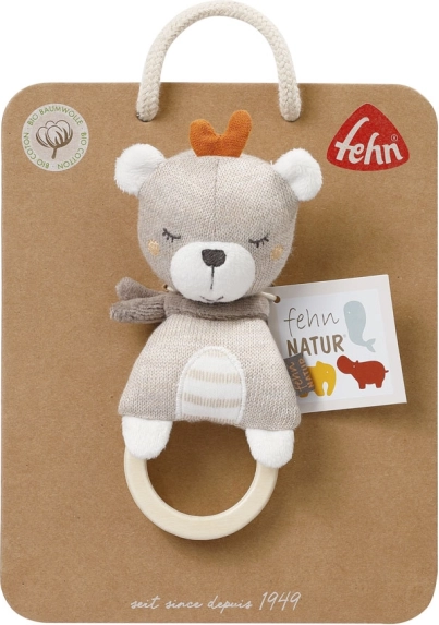 Entdecken Sie den kuscheligen Bär von FehnNatur aus Bio-Baumwolle, der Babys durch Greifen und Spielen mit einem Holzgriff fördert.