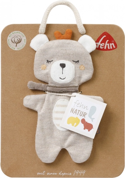 Der gehäkelte Körper des Bären besteht aus Bio-Baumwolle, im Inneren befindet sich Knisterpapier, das beim Drücken Geräusche macht. Das Greifspielzeug fördert spielerisch das Hören, Greifen und Tasten sowie die Feinmotorik des Babys. Die praktische Größe ermöglicht es, den Esel überallhin mitzunehmen.