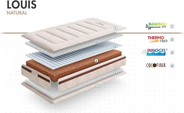 Der Kern aus Kokosfaser ist 100% natürlich und umweltfreundlich. Er bietet eine hohe Atmungsaktivität und optimale Belüftung. Dank der Visco Innogel®-Schicht ist die Matratze Louis sehr anpassungsfähig.