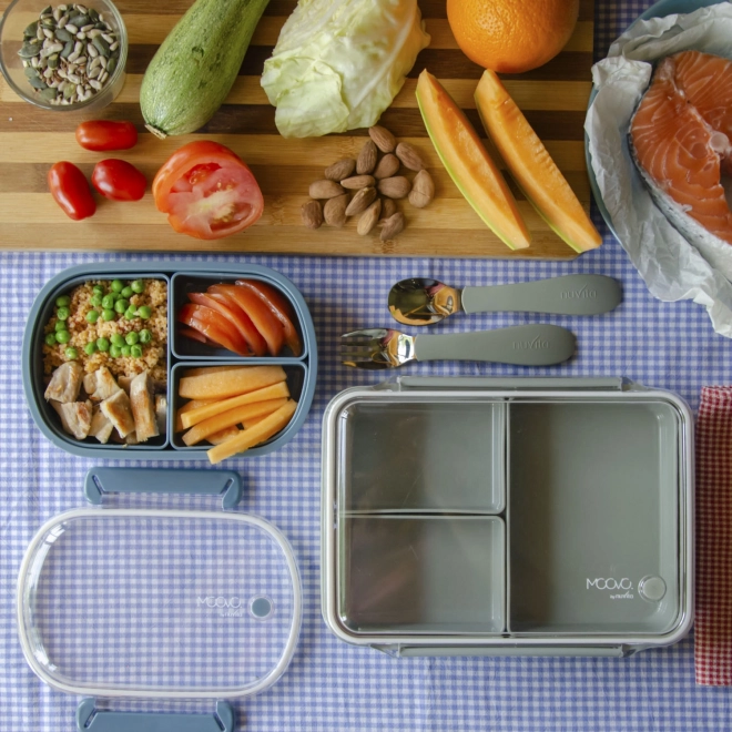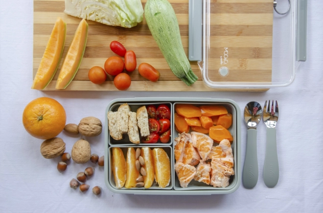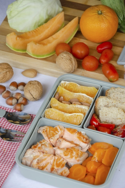 Entdecken Sie den vielseitigen Lunchbox in Salbeigrün mit 3 herausnehmbaren Fächern für eine praktische Aufbewahrung von Mahlzeiten. Spülmaschinenfest und mikrowellentauglich.