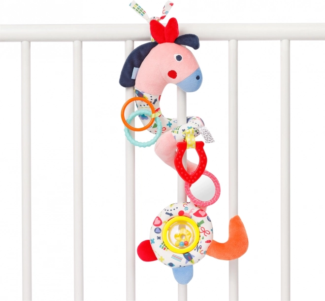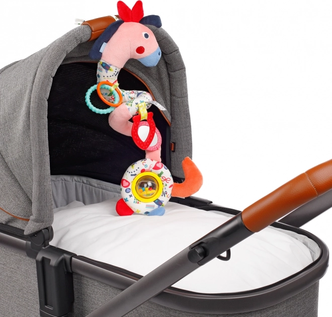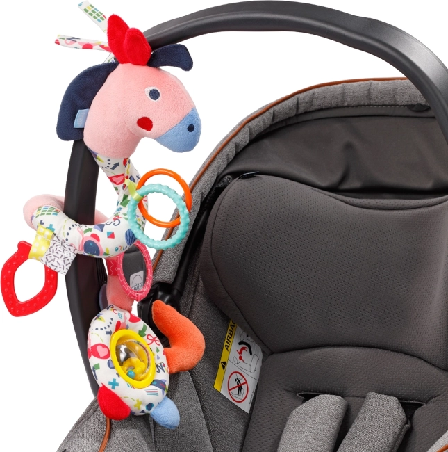 Das multifunktionale Spiralpferd aus der COLOR Friends Kollektion bietet eine Vielzahl von Spielmöglichkeiten zu Hause und unterwegs. Das Kinderwagen-Spielzeug lädt mit seiner bunten Kombination aus Funktionen und Farben zum Beobachten, Spielen und Greifen ein und ist zudem ein echter Hingucker. Verstecktes Tiergeräusch, Knisterpapier, zwei Greifringe, ein weiches Beißteil, ein kleines Spiegelchen, eine Quietsche und eine große Kugelrassel fördern die Hand-Auge-Koordination, das Hören und Fühlen sowie die Motorik des Kindes. Mit zwei Riemen lässt sich das Lernspielzeug schnell und flexibel an Babyschale, Kinderwagen, Bettchen und Laufstall befestigen. So wird jedes Abenteuer zu einem spannenden Erlebnis!