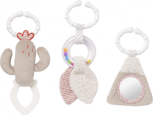 Drei Anhänger mit Meerestieren fördern die Aufmerksamkeit des Kindes und sorgen für Unterhaltung. Quietsche, Rassel, Knisterfolie und Spiegel unterstützen die Motorik des Kindes von Geburt an.