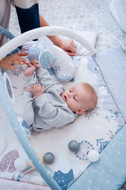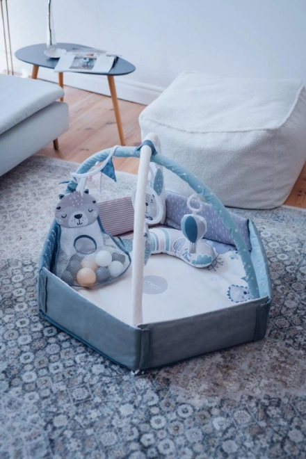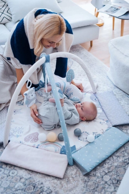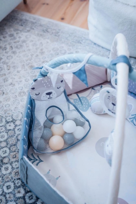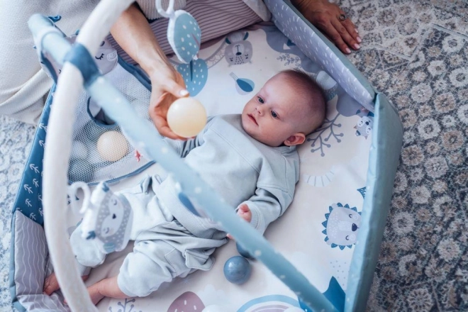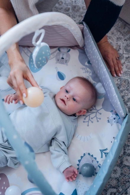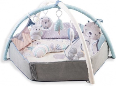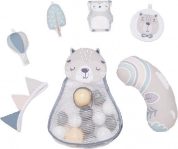 Diese Spieldecke ist aus strapazierfähigem Material mit thermoisolierenden Eigenschaften gefertigt und bietet Komfort und Sicherheit. Die Verwendung sanfter Pastellfarben wirkt beruhigend und unterstützt die visuelle Entwicklung des Kindes. Ergänzt durch sensorische Spielzeuge, die die Sinne der Kinder stimulieren und Freude am Spielen bieten.