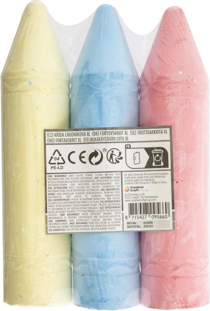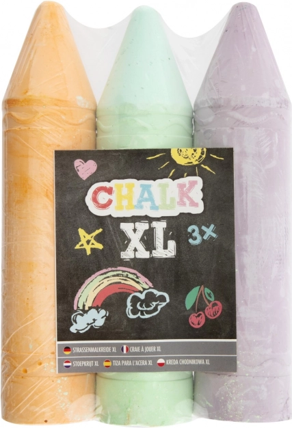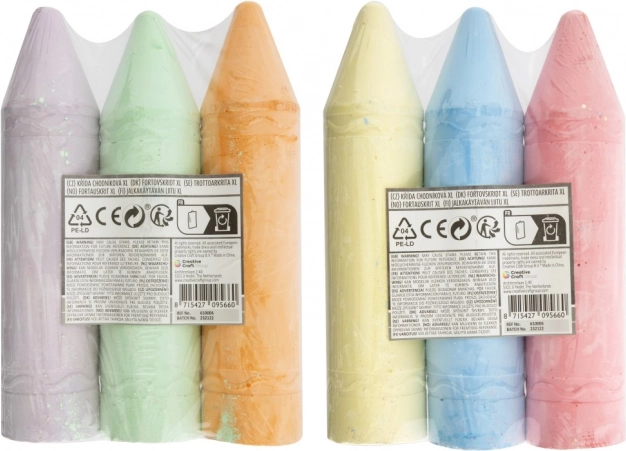 Bereichern Sie Ihre Zeichenaktivitäten mit diesen bunten XL-Kreiden, die in zwei Varianten erhältlich sind - gelb, blau und rosa oder orange, grün und violett. Jede Packung enthält drei Kreiden, die mit ihrer optimalen Länge von 19 cm das Halten beim Zeichnen erleichtern.