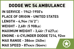 Dieses realistische Modellbau-Set des Dodge WC 54 ermöglicht es, ein Stück Geschichte mit authentischen Details nachzubilden. Das Modell ist im Maßstab 1:35 und bietet dank der lizenz von RAM TRUCKS eine hohe Qualität und Genauigkeit. Mit seinen 293 Bausteinen und einer Figur ist es ideal nicht nur für Modellbauer, sondern auch für Liebhaber der Militärgeschichte.