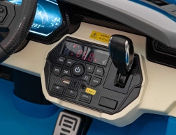 Öffnende Türen, LED-Lichter, beleuchteter Start mit Motorgeräuschen und Doppelsitz aus Ökoleder. Erweitertes Audio-Panel mit Bluetooth, USB, AUX und MP3.