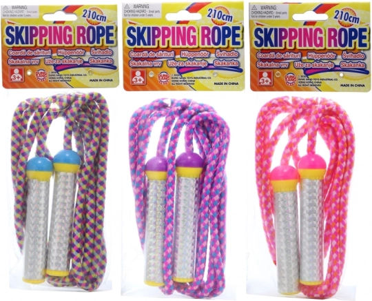 Fröhliches, buntes Springseil für Kinder. Ideal für Spaß und die Entwicklung motorischer Fähigkeiten. Leichte Plastikgriffe sorgen für einen einfachen Halt, auch für die Kleinsten.