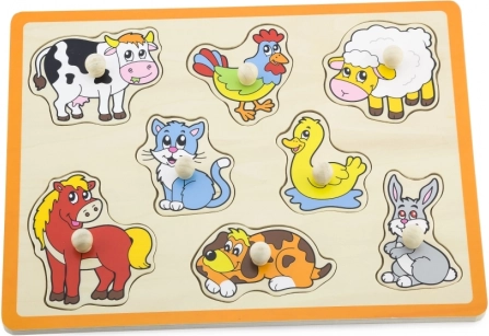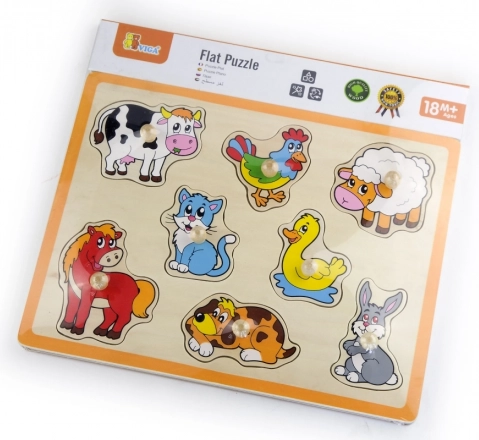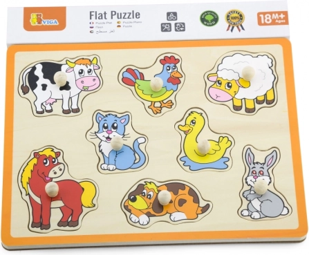 Holzpuzzle von der Firma Viga ist darauf ausgelegt, die Fantasie und motorischen Fähigkeiten der Kinder zu stimulieren. Es besteht aus einem Brett und 8 thematischen Knopfstücken für einfaches Greifen. Die Teile stellen Tiere dar und müssen in die entsprechenden Öffnungen auf dem Brett eingesetzt werden.
