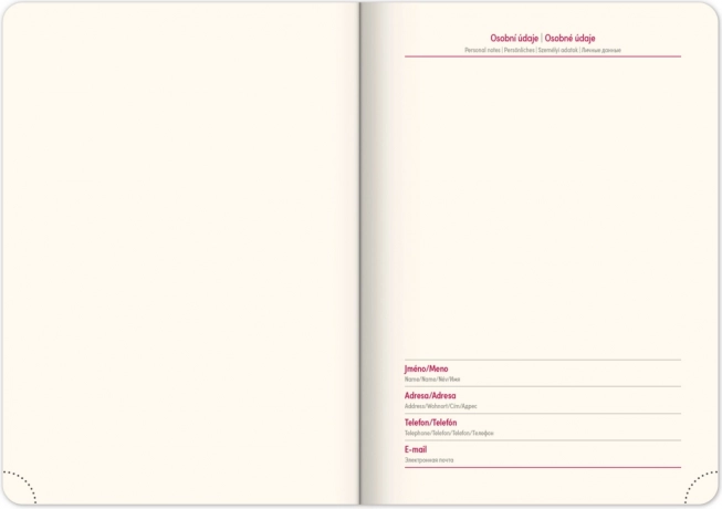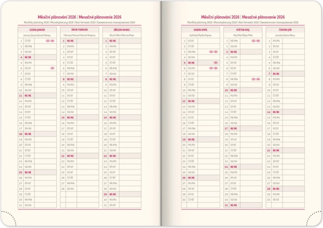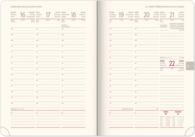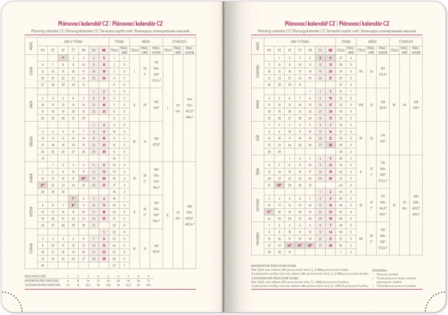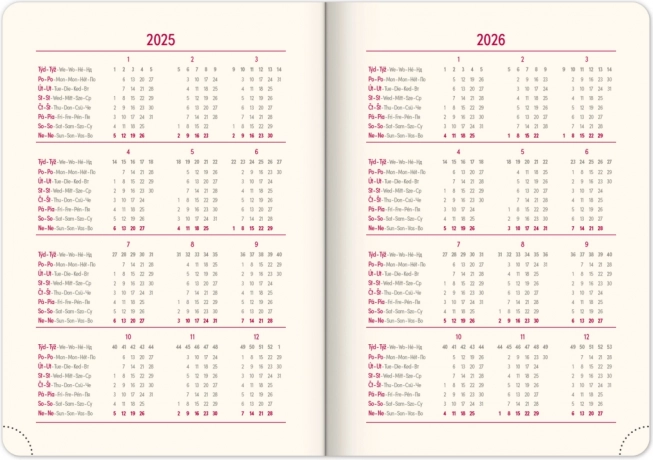 Wöchentlicher Planer Notique Twill 2025 in eleganter blau-silberner Farbe ist das ideale Hilfsmittel zur Organisation Ihrer Tage. Er bietet eine übersichtliche Wochenansicht mit einem tschechisch-slowakischen Kalender und mehrsprachigen Beschriftungen.
