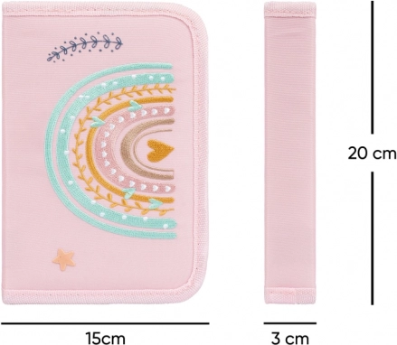 Praktisches, modernes Etui in rosafarbenen Pastelltönen mit Regenbogenmotiv begeistert Schulkinder und Studierende. Die einlagige Ausführung mit zwei Klappen ermöglicht eine übersichtliche Organisation und schnellen Zugriff auf alle Utensilien. Strapazierfähige Materialien und der YKK-Reißverschluss sorgen für eine lange Lebensdauer im täglichen Gebrauch.