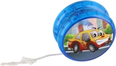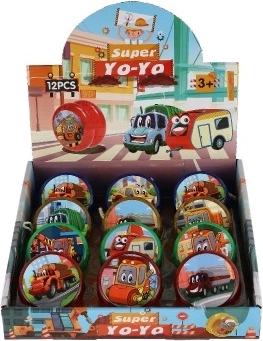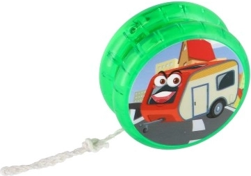Das Jojo ist in mehreren Farbvarianten erhältlich, darunter Blau, Rot, Grün und Gelb, alle mit fröhlichen Bildern von Fahrzeugen.