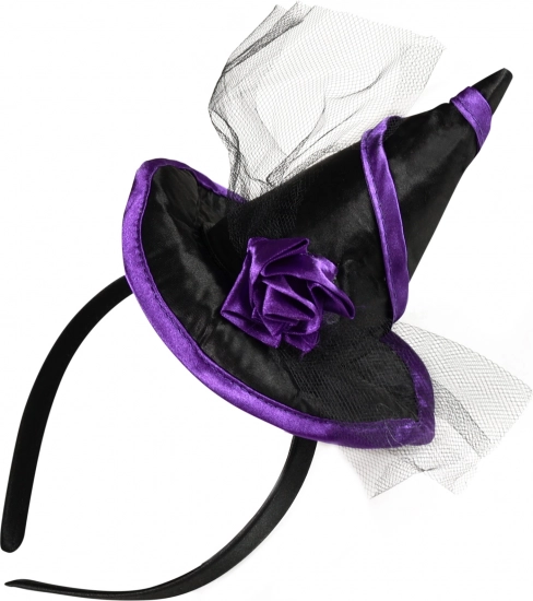 Stilvoller Hexen-Haarreif – das perfekte Accessoire für Party, Karneval und Halloween. Kombiniert schwarz‑violettes Design, einen satinierten Mini-Hut und eine Tüll-Blütendekoration für einen markanten, fotogenen Look.