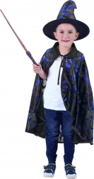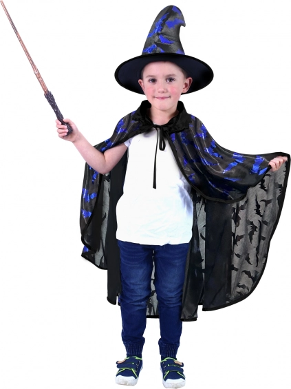 Stylisches Set für kleine Zauberer und Hexen – perfekt für Karneval, Partys und Halloween. Enthält einen schwarzen Umhang mit blau‑violettem Fledermausmotiv und einen passenden Hut. Leichtes und bequemes Kostüm für Kinder von 3–7 Jahren mit 72 cm Länge, in dem sie strahlen und Spaß haben ohne Einschränkungen.