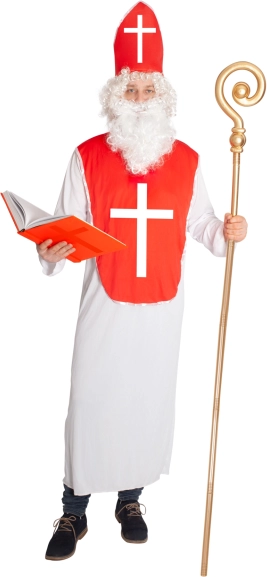 Dieses Nikolaus-Kostüm für Erwachsene besteht aus einem langen weißen Gewand (ca. 145 cm ab Schulter) und einer roten Brustpartie mit markantem weißem Kreuz. Zudem ist eine Mütze mit Klettverschluss für schnelles und sicheres Befestigen enthalten. Dank des universellen Schnitts ist das Kostüm angenehm zu tragen und lässt sich gut schichten.