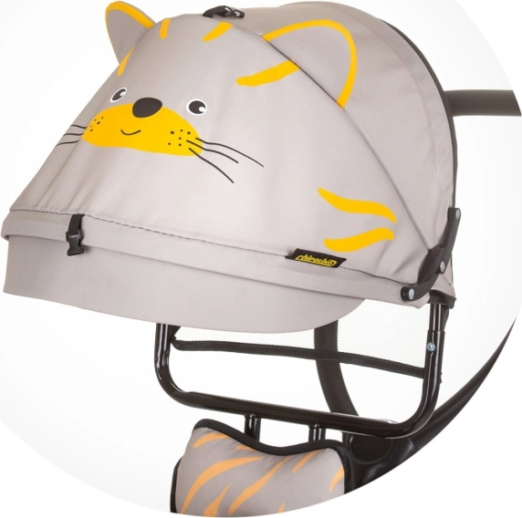 Das Dreirad verfügt über ein lustiges Design im Tiger-Stil, einschließlich Ohrdetails am Verdeck.