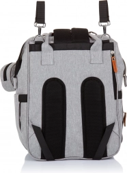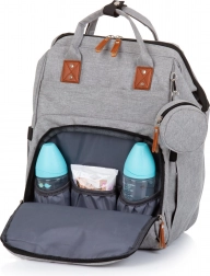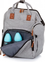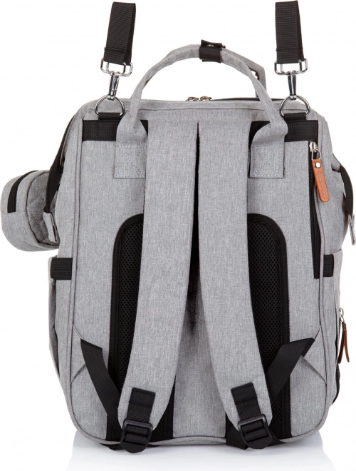 Der stylische Wickelrucksack in Grau vereint modernes Design mit maximaler Funktionalität. Dank zahlreicher Taschen, darunter drei innere Thermotaschen für Flaschen, finden Sie alles Wichtige – von Windeln bis zum Snack – im Handumdrehen. Der Rucksack lässt sich leicht am Kinderwagengriff befestigen und trägt sich dank der gepolsterten Gurte auch auf dem Rücken sehr komfortabel.