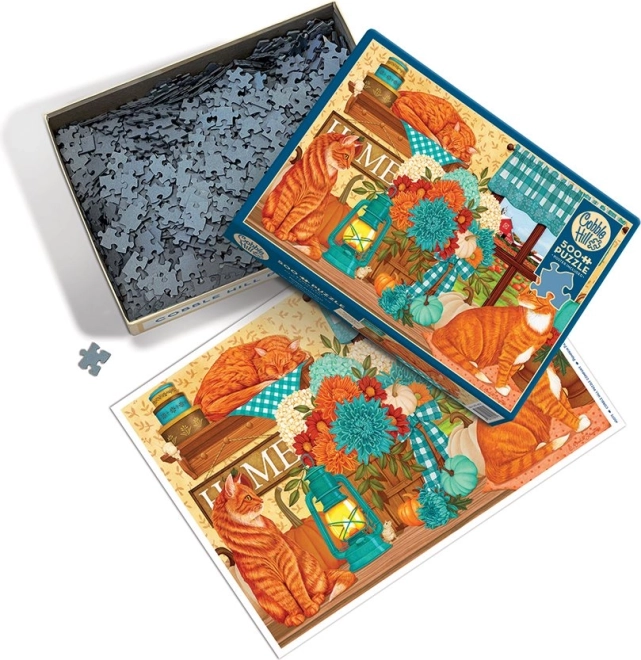Entdecken Sie die einzigartige Herausforderung mit dem Puzzle von COBBLE HILL. Lassen Sie sich von der wunderschönen Szenerie mit herbstlichen Farben und drei orangen Katzen überraschen. Dieses Puzzle bietet: