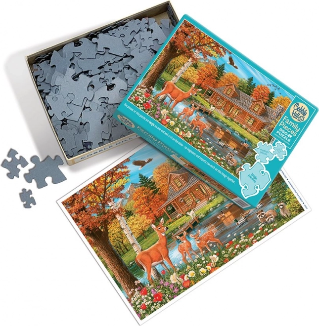 Das Familienpuzzle von COBBLE HILL ist so gestaltet, dass alle Freude am Puzzeln haben – von den Kleinsten bis zu den Erwachsenen. Das Motiv des idyllischen Teichs am Landhaus vermittelt eine ruhige Atmosphäre und bietet schöne Details, die es zu entdecken gilt. Die Aufteilung des Puzzles in Zonen mit unterschiedlichen Teilgrößen ermöglicht ein bequemes Nebeneinander-Puzzeln.