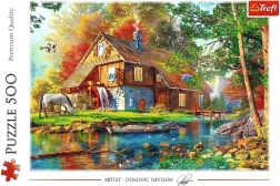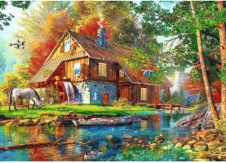 Entdecken Sie den Zauber des Landlebens mit einem Puzzle, das nach dem Zusammensetzen ein Bild mit den Maßen 480 × 340 mm ergibt. Die Illustration von Dominic Davison zeigt ein idyllisches Häuschen an einem ruhigen Bächlein, umgeben von Natur – ein ideales Motiv für Momente der Erholung und Konzentration.