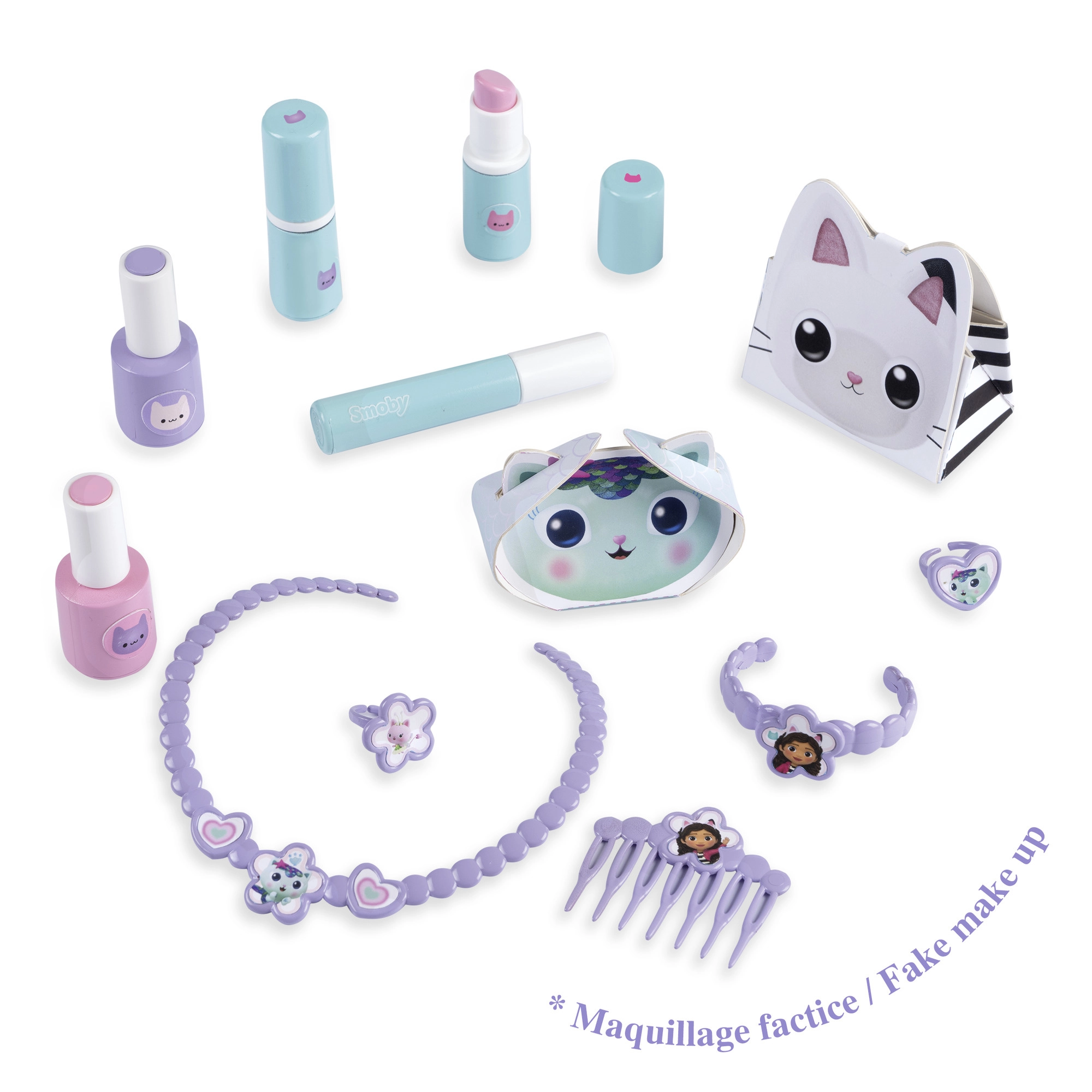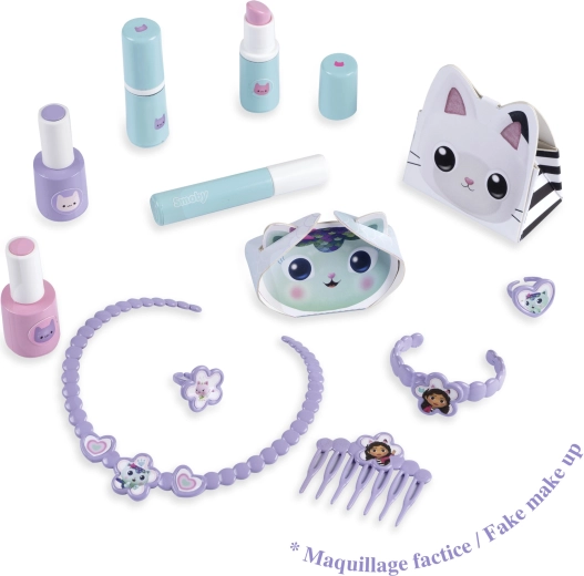 Enthalten sind „kosmetische“ Fläschchen, Lippenstifte, Mascara, Kamm, Halskette, Armband, Ringe und mehr für realitätsnahes Spiel.