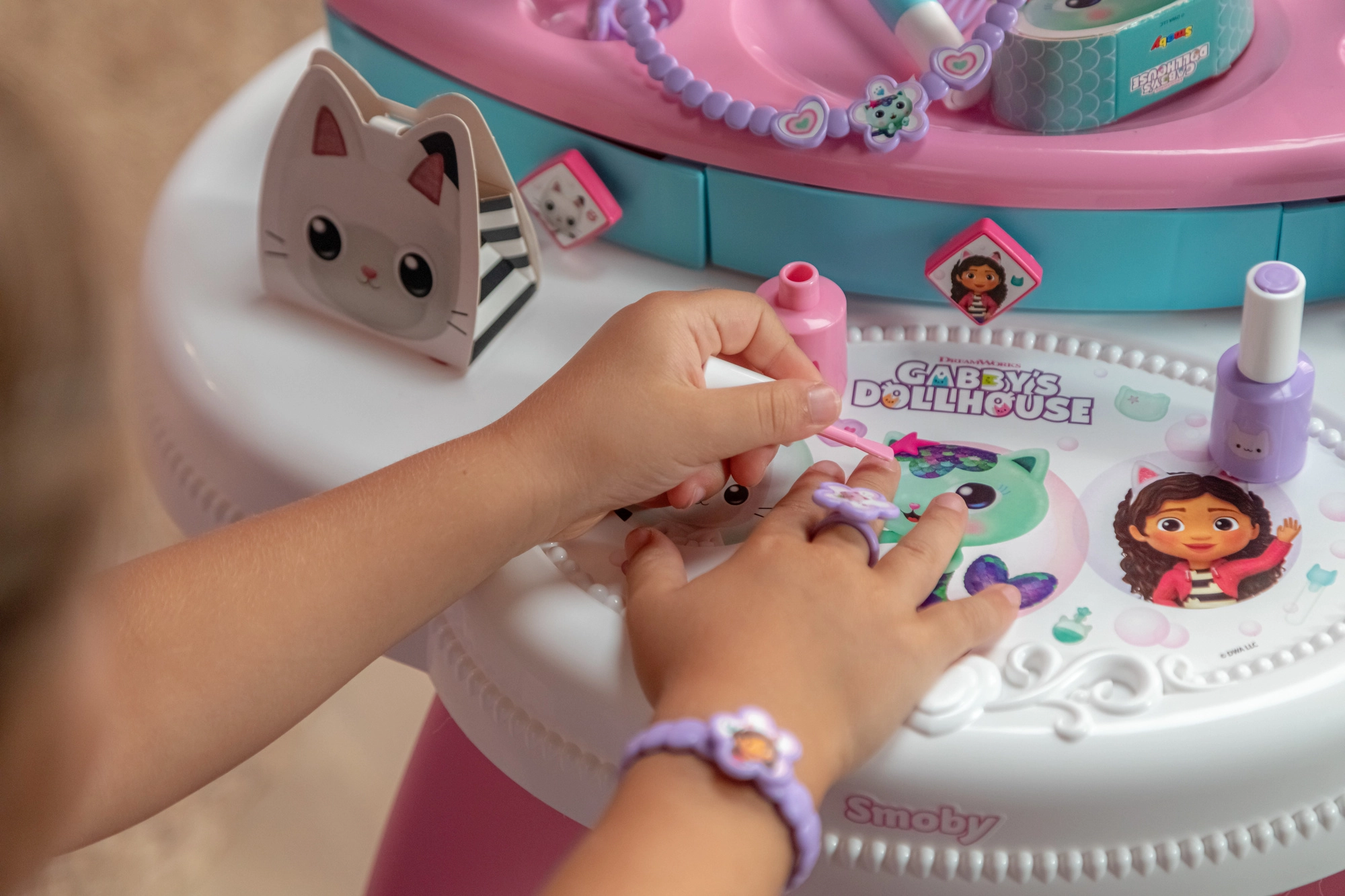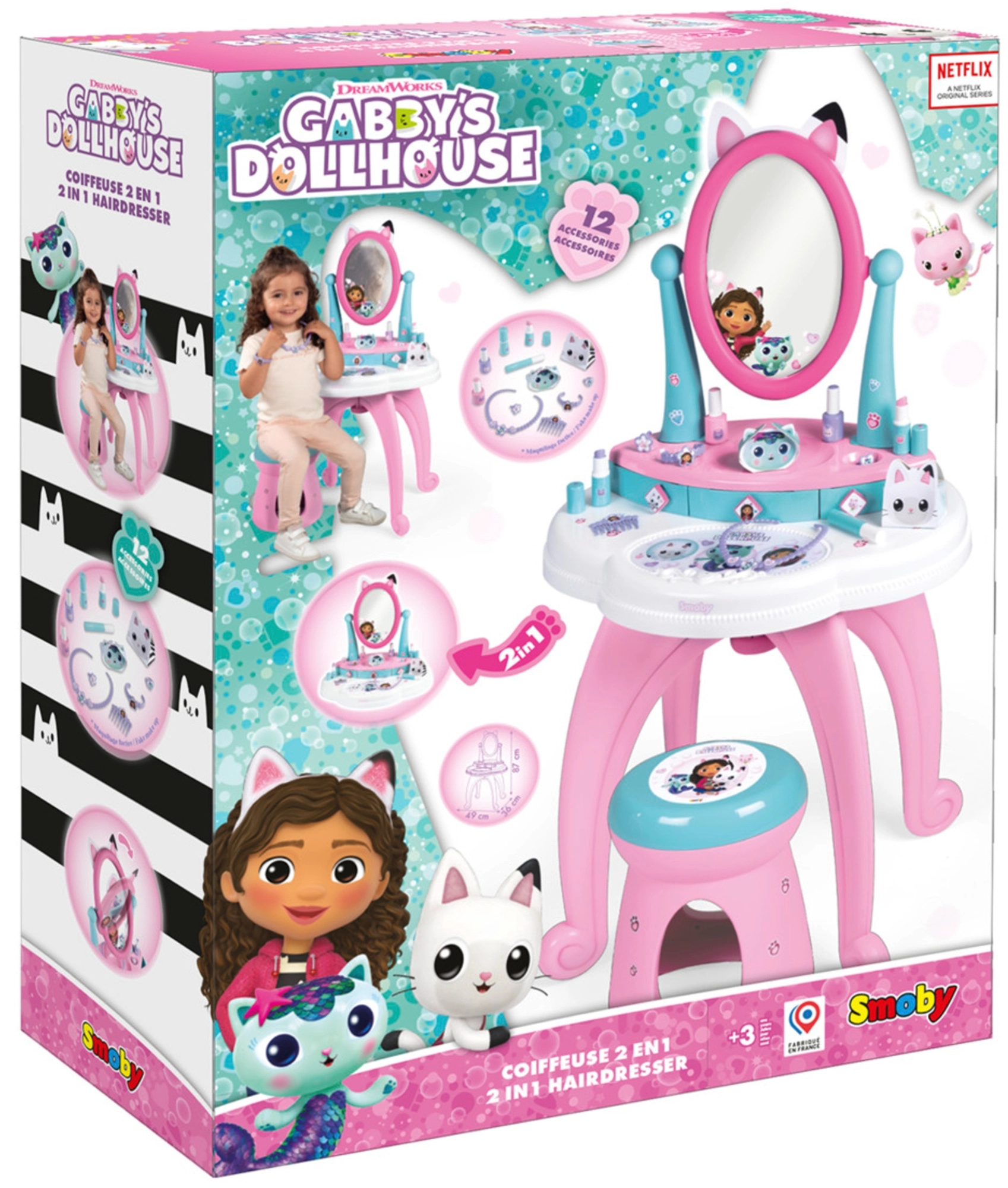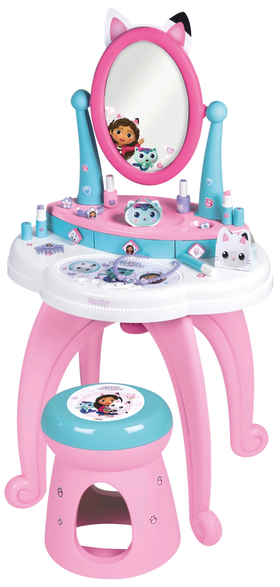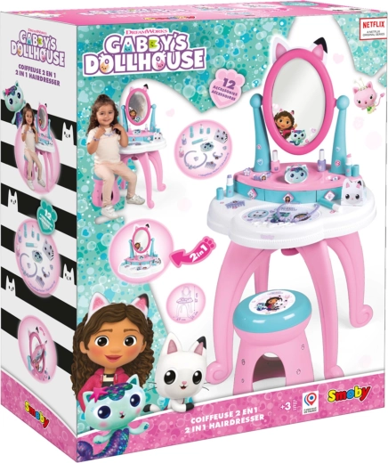 Der von der beliebten Serie GABBY’S DOLLHOUSE inspirierte Kinderschminktisch verwandelt das Kinderzimmer in ein kleines Kosmetikstudio. Dank des großen verstellbaren Spiegels, der drei Schubladen und des umfangreichen Zubehörsets ist alles griffbereit – für ein realitätsnahes und sicheres Spielerlebnis.