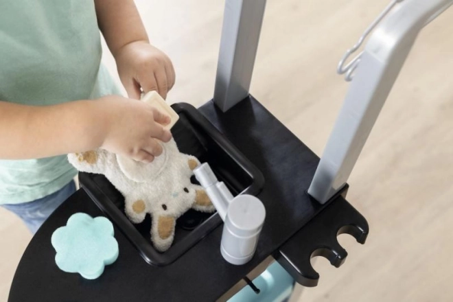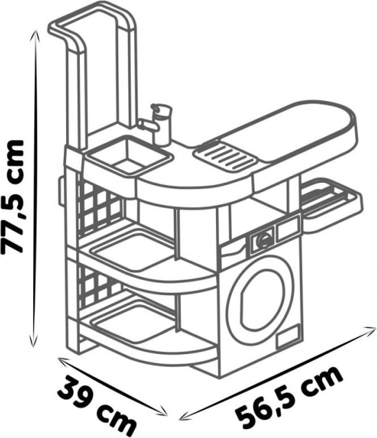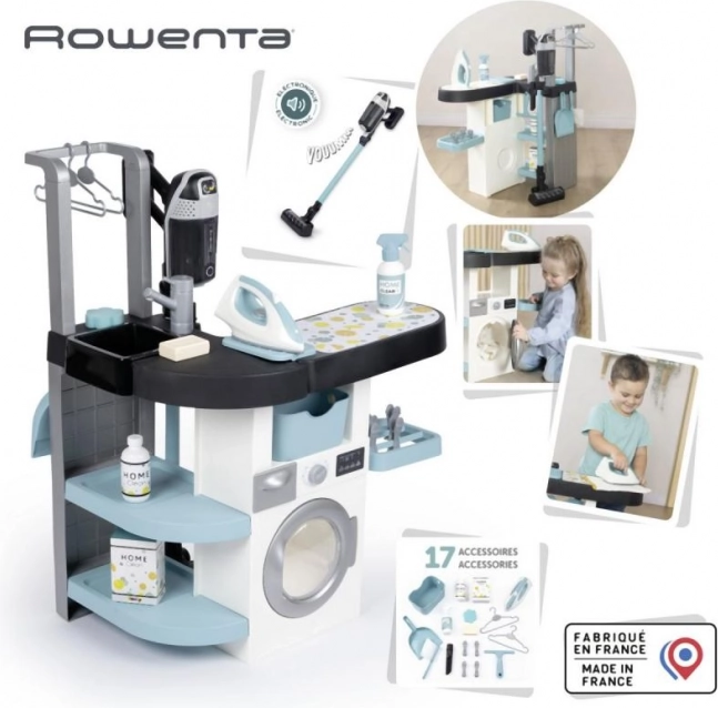 Die Kinderwäscherei mit Bügeleisen und Staubsauger Rowenta ist die perfekte Wahl für kleine Haushaltshilfen. Sie umfasst vier Spielbereiche: Waschmaschine, Waschbecken für Handwäsche, Trockenbereich und ein Bügelbrett, die Kindern mehr über häusliche Pflichten beibringen.