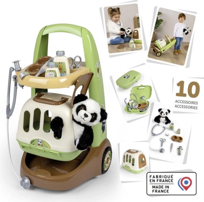 Der Smoby Tierarztwagen mit Panda bietet Kindern ab 3 Jahren ein authentisches Tierarzt-Rollenspiel. Dank der cleveren 2-in-1-Lösung dient die praktische Box sowohl als Transportbox für Tiere als auch als separater fahrbarer Arztkoffer. Der Wagen verfügt über leicht laufende Räder, lässt sich daher auch von jüngeren Kindern leicht steuern und bietet zugleich reichlich Platz zur Aufbewahrung der gesamten Ausrüstung.