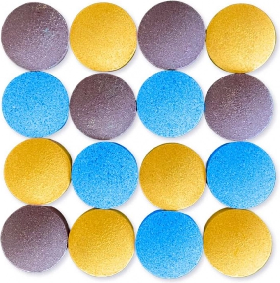 Vier kräftige Farben (Blau, Rosa, Lila, Gelb) gehen beim Auflösen ineinander über und verwandeln Ihr Bad in ein spielerisches Farbtheater.