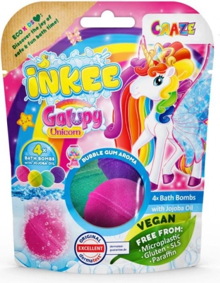 Bringe Freude und Farbe ins Kinderbad mit INKEE Galupy Unicorn. Jede Bombe sprudelt sanft im Wasser, setzt spielerische Farben und den süßen Kaugummi-Duft frei, während Jojobaöl hilft, die Haut weich zu halten.