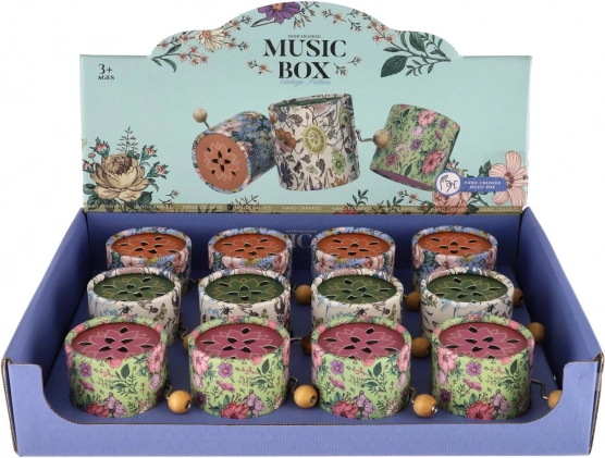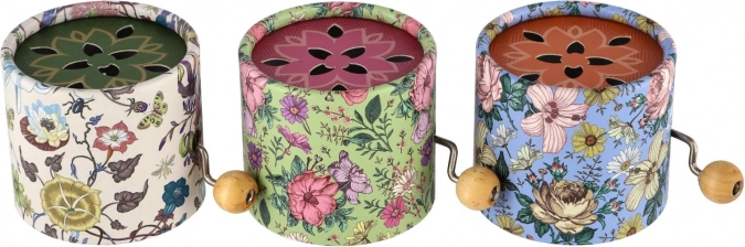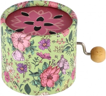 Die Spieluhr ist in mehreren Farbvarianten mit dekorativem Blumenmuster erhältlich. Handbetriebener Mechanismus benötigt keine Batterien und ist daher jederzeit einsatzbereit. Empfohlen für Kinder ab 3 Jahren.