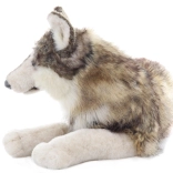 Der Plüschwolf hat ein realistisches Aussehen mit Farben und Mustern, die das echte Fell eines Wolfs nachahmen.