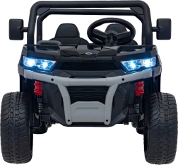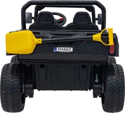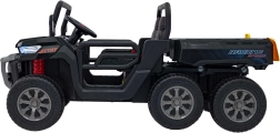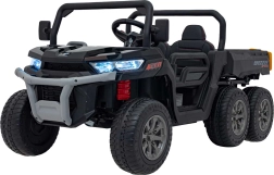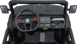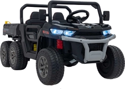 Die kleinen Fahrer freuen sich über ein realistisches Cockpit mit Beleuchtung, Sounds am Lenkrad und Multimedia-Panel (MP3/USB/AUX/Bluetooth). Die praktisch per Knopfdruck kippbare Ladefläche mit öffnender Bordwand ermöglicht den Transport von Spielzeug und kleiner Fracht. Der Sitz aus Eco-Leder sorgt auch auf längeren Fahrten für Bequemlichkeit.