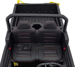 Sitz aus Eco-Leder, Sounds am Lenkrad, LED-Lichter und Multimedia-Panel MP3/USB/AUX/Bluetooth. Elterliche Aufsicht gewährleistet die 2,4-GHz-Fernbedienung mit STOP.