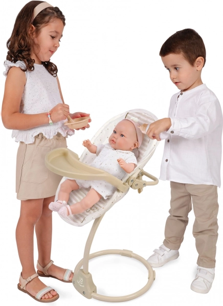 Dieser multifunktionale 3-in-1-Hochstuhl und die Schaukel für Puppen aus der Verona-Kollektion bieten Kindern realistisches Spielen und viele Möglichkeiten, ihr Lieblingsbaby zu versorgen. Die Kombination aus hellem Beige und Weiß mit Punkt- oder Streifenmustern, ergänzt durch dezente Einfassungen und Schleifendetails, schafft einen zeitlosen natürlichen Look, inspiriert vom spanischen Design.