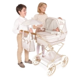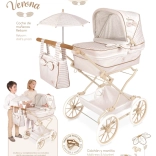 Der bezaubernde REBORN Puppenwagen Verona 2024 in Hellbeige und Weiß mit dezenten Punkten und Streifen überzeugt durch präzise spanische Verarbeitung und ein zeitloses Design. Dank der höhenverstellbaren Griffstange (65–90 cm) passt er sich perfekt dem Wachstum des Kindes an und ist leicht zu manövrieren.