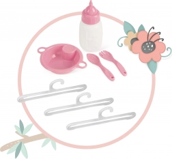 Das Set enthält alles für die komplette Pflege: Bettchen mit transparentem Netzfenster, Mobile mit Blättern, Wickelauflage, Hochstuhl mit Kunststoff-Set (Flasche, Schälchen, Besteck) sowie einen großen Kleiderschrank mit Reißverschluss, Stange und 3 Kleiderbügeln. Dank der platzsparenden Ausführung lässt sich das gesamte Ensemble leicht handhaben und nach dem Spielen schnell verstauen.