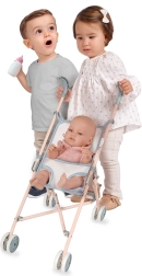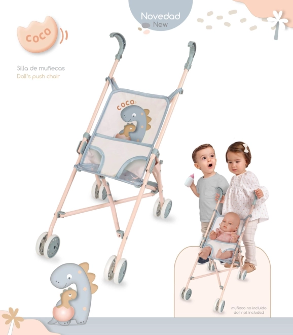 Leichter und kompakter Puppenwagen im zarten COCO-Design, ideal für kleine Kinder zu Hause und auf Ausflügen. Er bietet eine stabile Metallkonstruktion, einen Dreipunktgurt zur sicheren Befestigung der Puppe und einfaches Zusammenklappen mit Einklemmschutz für die Finger.