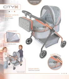 Die CITY X 2024-Kollektion vereint Premium-Textilien mit bedrucktem Design-PVC, das den Effekt „gläserner“ Flächen erzeugt. Das elegante Grau-Silber wird durch trendige kupferfarbene Elemente ergänzt, die Leichtigkeit und Luftigkeit des Wagens unterstreichen. Dank niedrigem Griff und stabilem Fahrgestell eignet sich der Wagen hervorragend für ganz kleine Mädchen und ist perfekt für Rollenspiele und die Entwicklung der Fantasie.