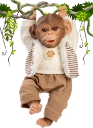 Ein niedliches und realistisches Babyäffchen mit weichem Stoffkörper, das Kinder und Sammler begeistert. Es hat einen Vinylkopf und Vinylgliedmaßen, ist positionierbar und kann sitzend platziert oder an Händen bzw. Füßen aufgehängt werden. Hochwertige Handarbeit in Spanien und eine Geschenkverpackung machen es zu einem tollen Geschenk für Kinder ab 3 Jahren.